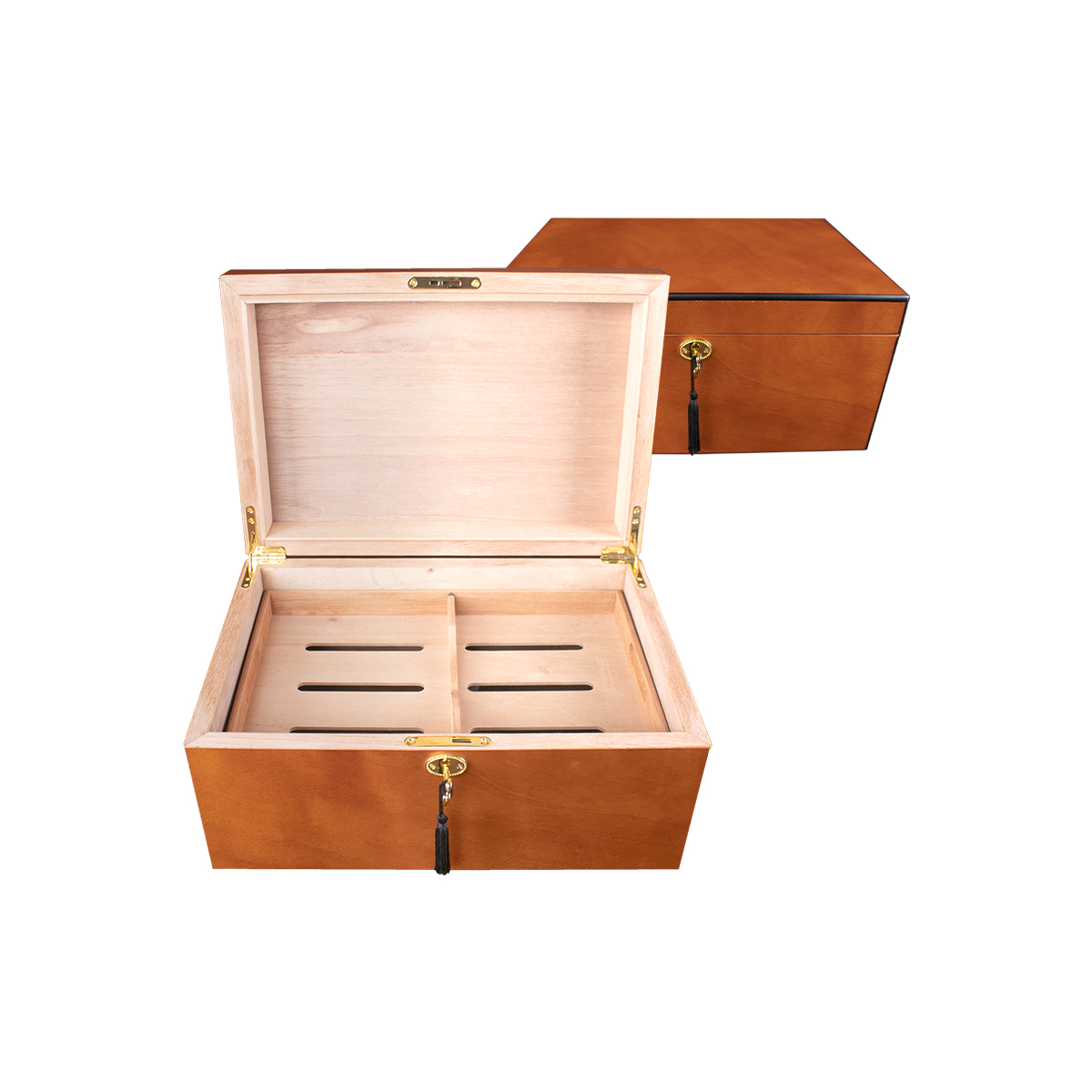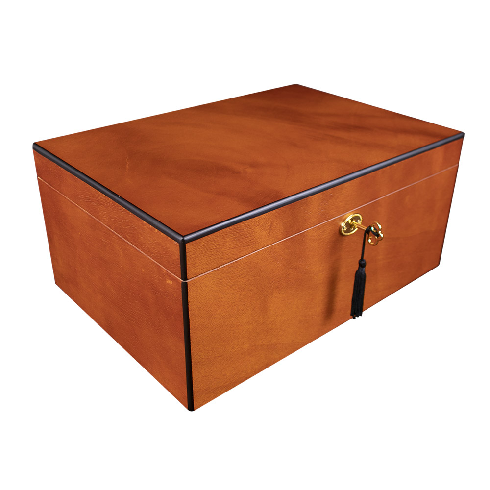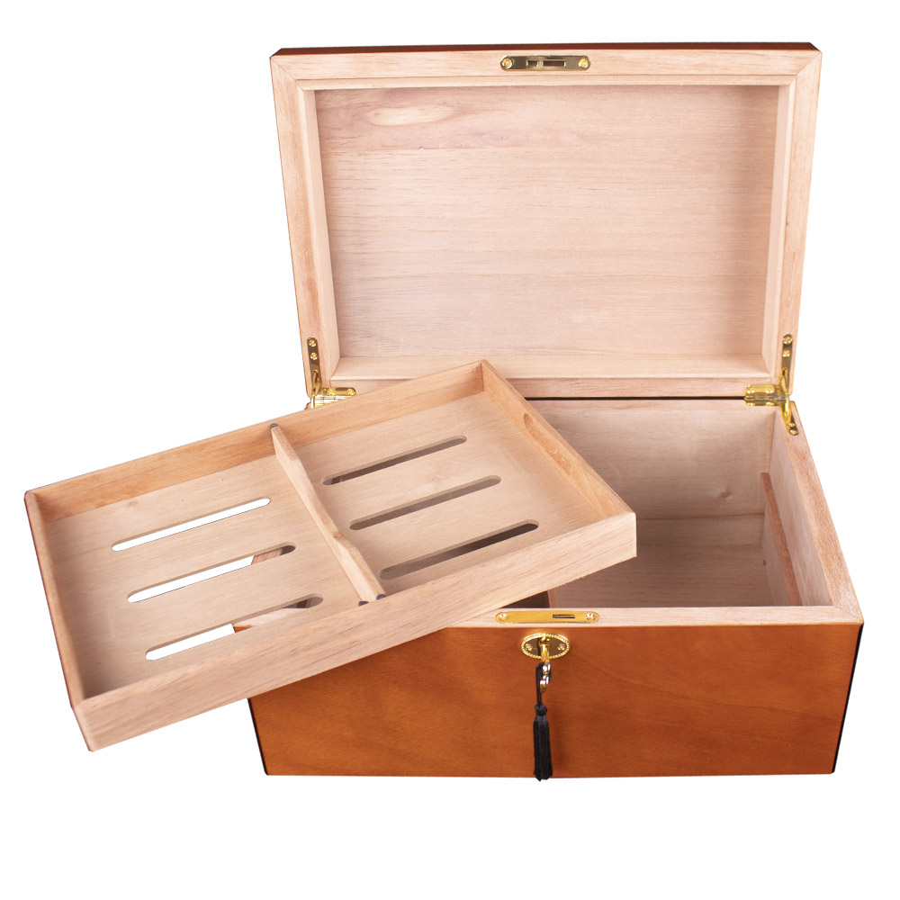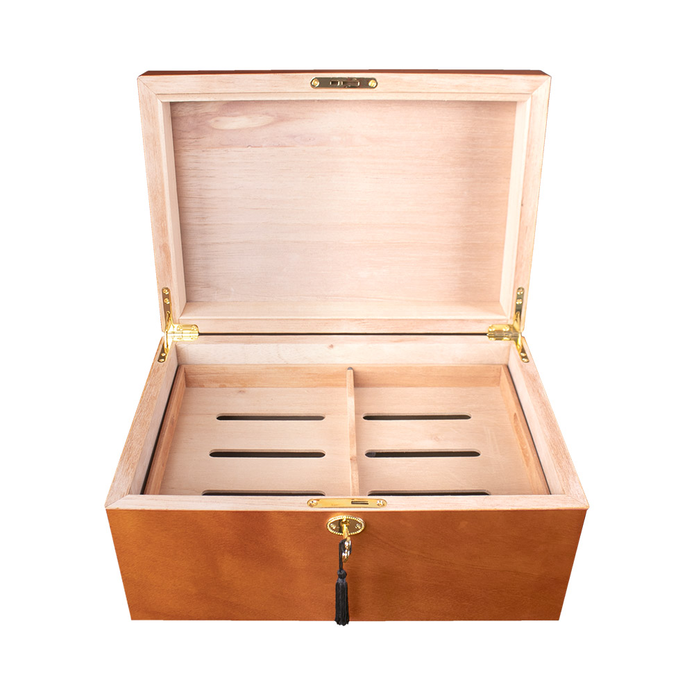 HUMIDOR DE MADERA COLOR NATURAL CON CHAROLA Y LLAVE PARA 60P