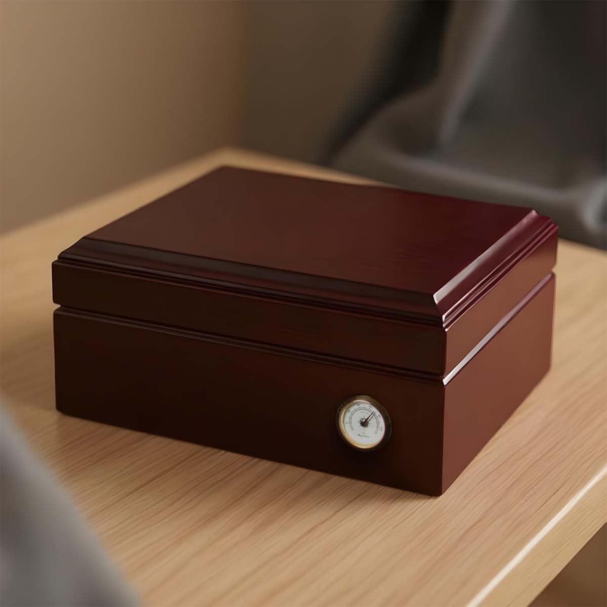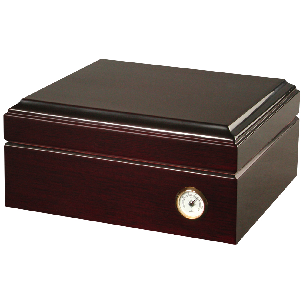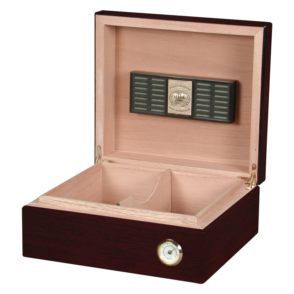 Humidor marca Park Lane color caoba inglesa con almacenamiento para 50 puros cuenta con sistema de humidificación e higrómetro. Incluye cortapuros, líquido humidificador y placa para personalizar. Diseño con bordes biselados.