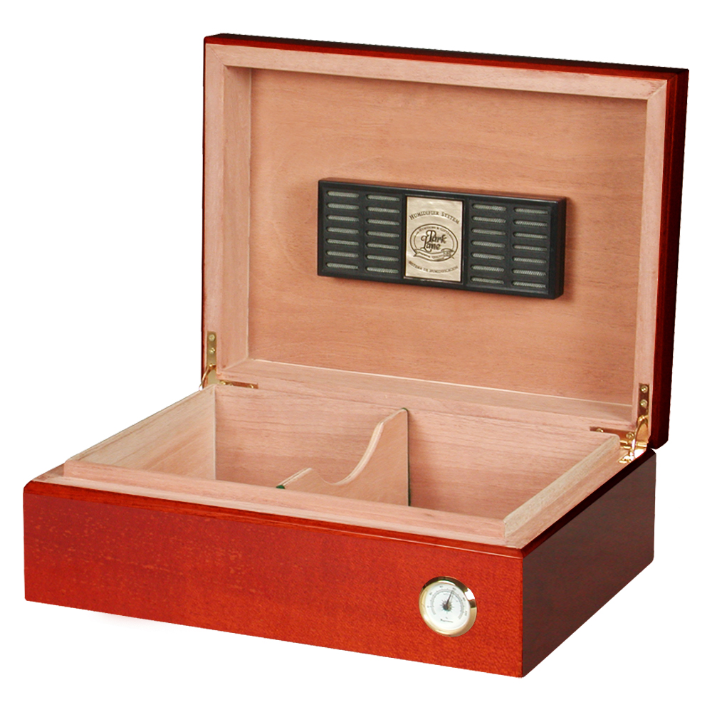 Humidor marca Park Lane color caoba con almacenamiento para 75 puros cuenta con sistema de humidificación e higrómetro. Incluye cortapuros, líquido humidificador y placa para personalizar. Diseño con bordes biselados.