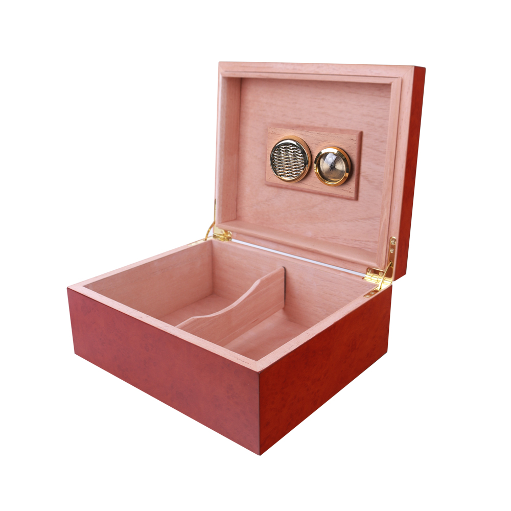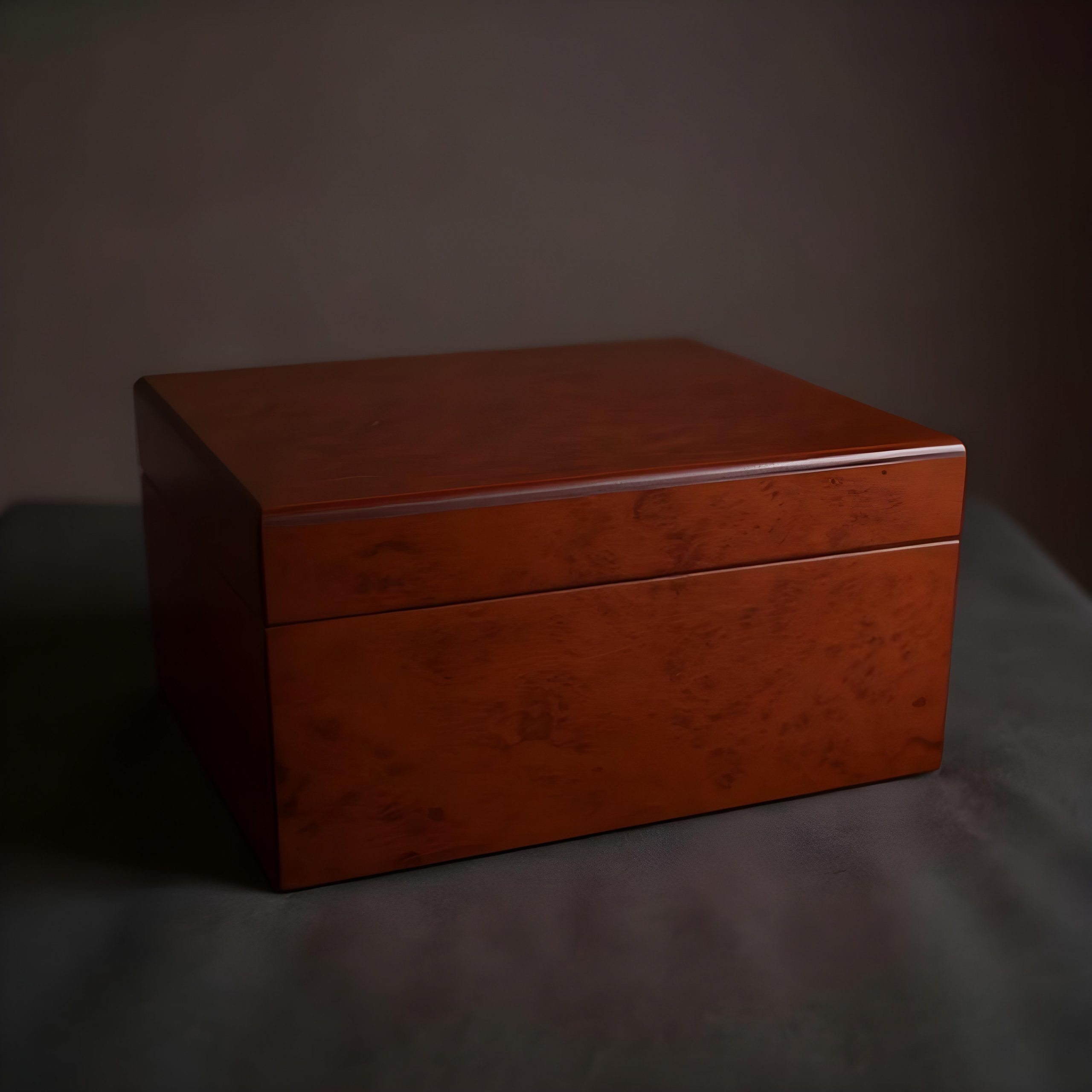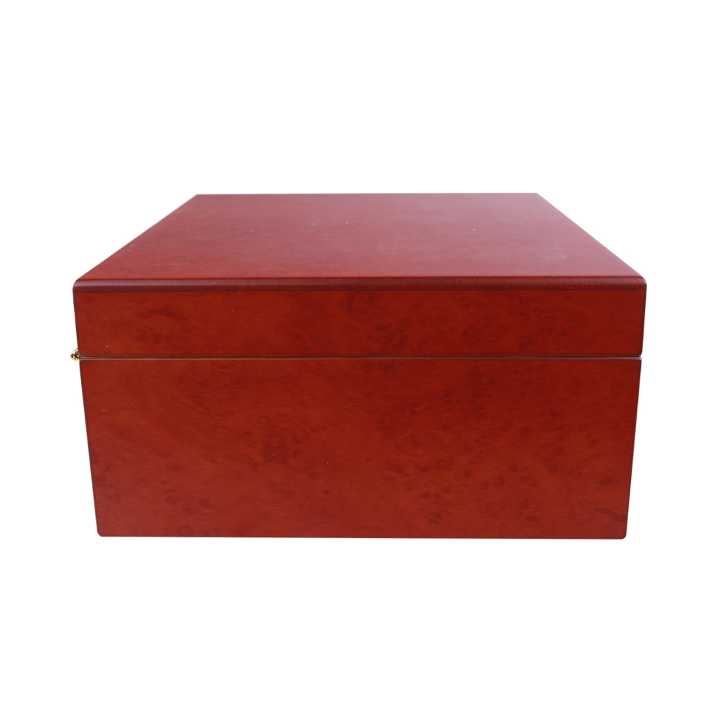 Humidor grande de madera resistente. Color caoba. Cuenta con accesorios dorados. Incluye sistema de humidificación e higrómetro. Acabado liso semi mate.