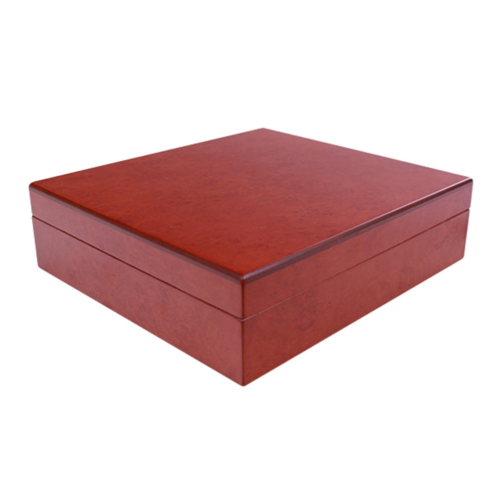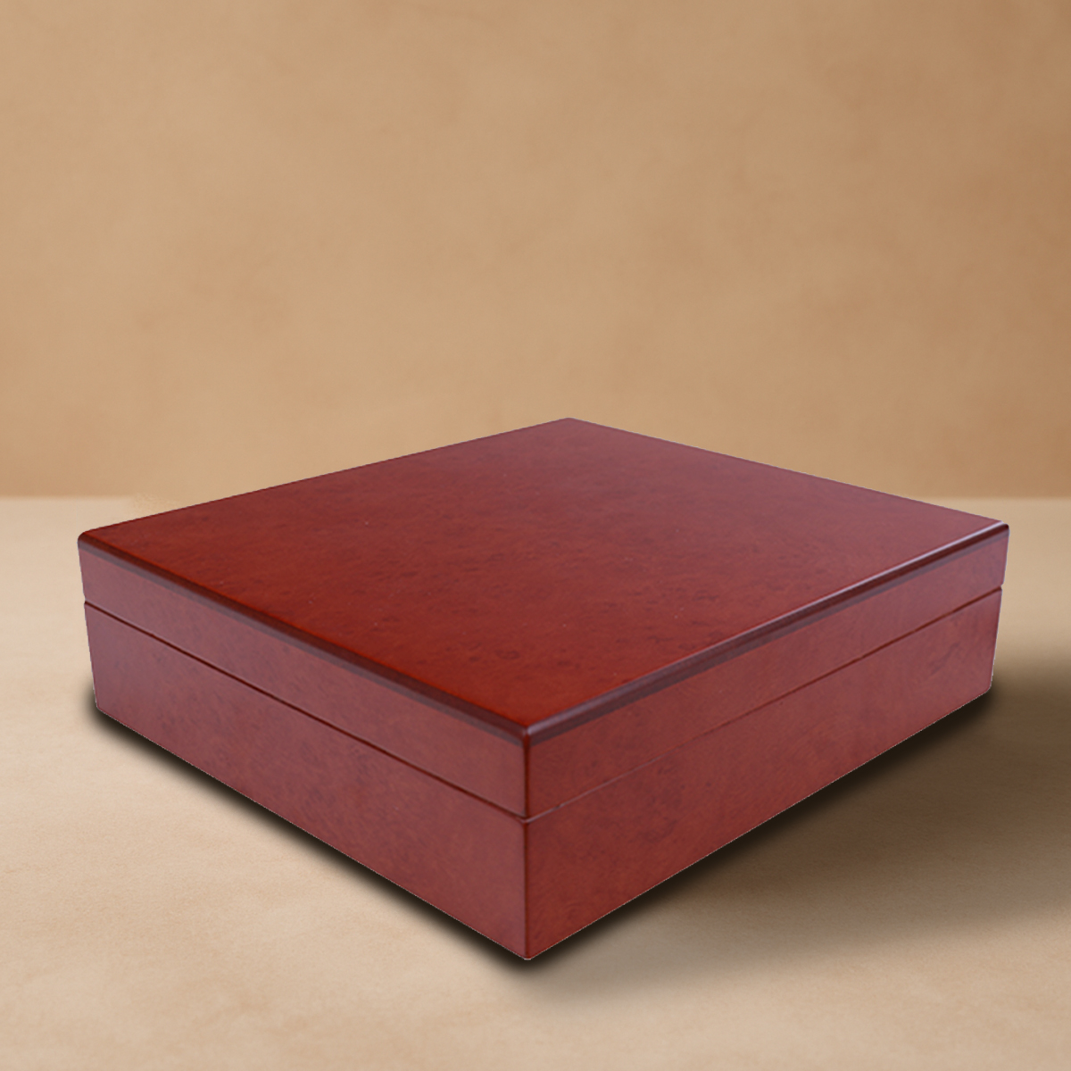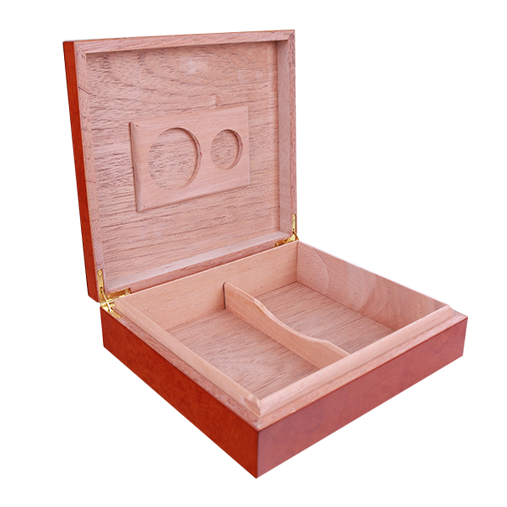Humidor small de madera resistente. Color caoba. Cuenta con accesorios dorados. Incluye sistema de humidificación e higrómetro. Acabado liso semi mate.