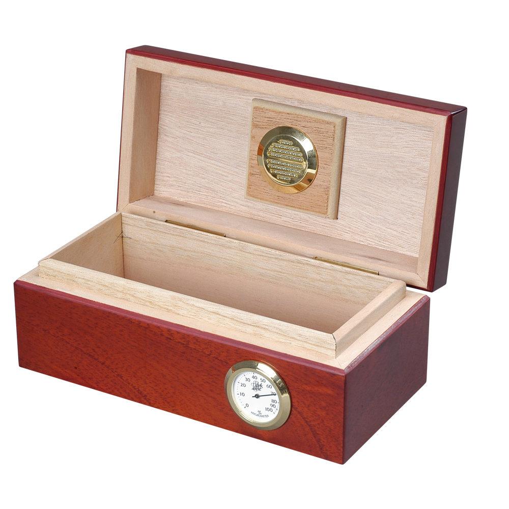 Humidor travel marca Park Lane color caoba inglesa con almacenamiento para 12 puros cuenta con sistema de humidificación e higrómetro. Diseño con bordes biselados.